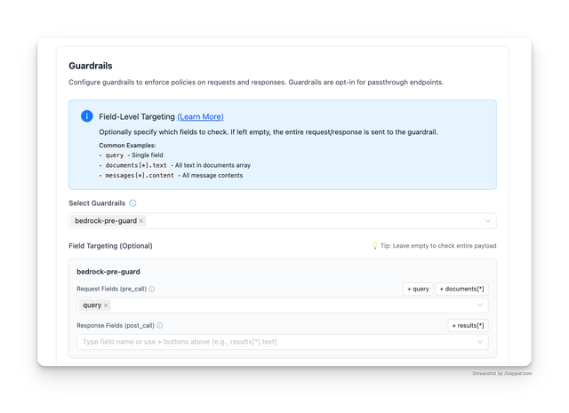 2. If request_fields is specified (e.g., ["query"]), only those fields are sent to the guardrail. Otherwise, the entire request payload is evaluated.